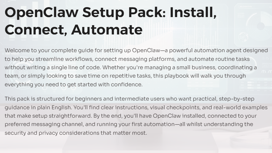 OpenClaw Setup Pack is a click-by-click, non-dev friendly guide to installing OpenClaw, configuring it properly, and integrating it into your workflow so you can deploy a working agent fast. It also includes the security parameters most people skip—safe token handling, least-privilege permissions, and simple guardrails—so you don’t accidentally expose access or data while you’re setting it up.