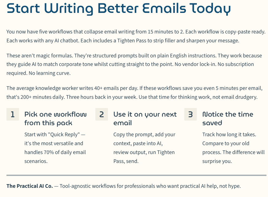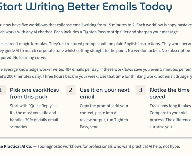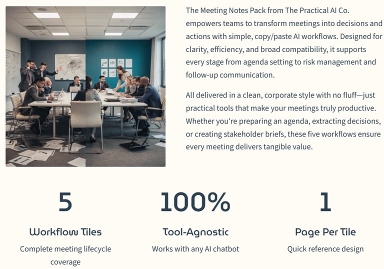 Practical prompt templates for emails, meetings, research, planning, and decision briefs. Tool-agnostic, beginner-friendly, and built to produce clean outputs fast.